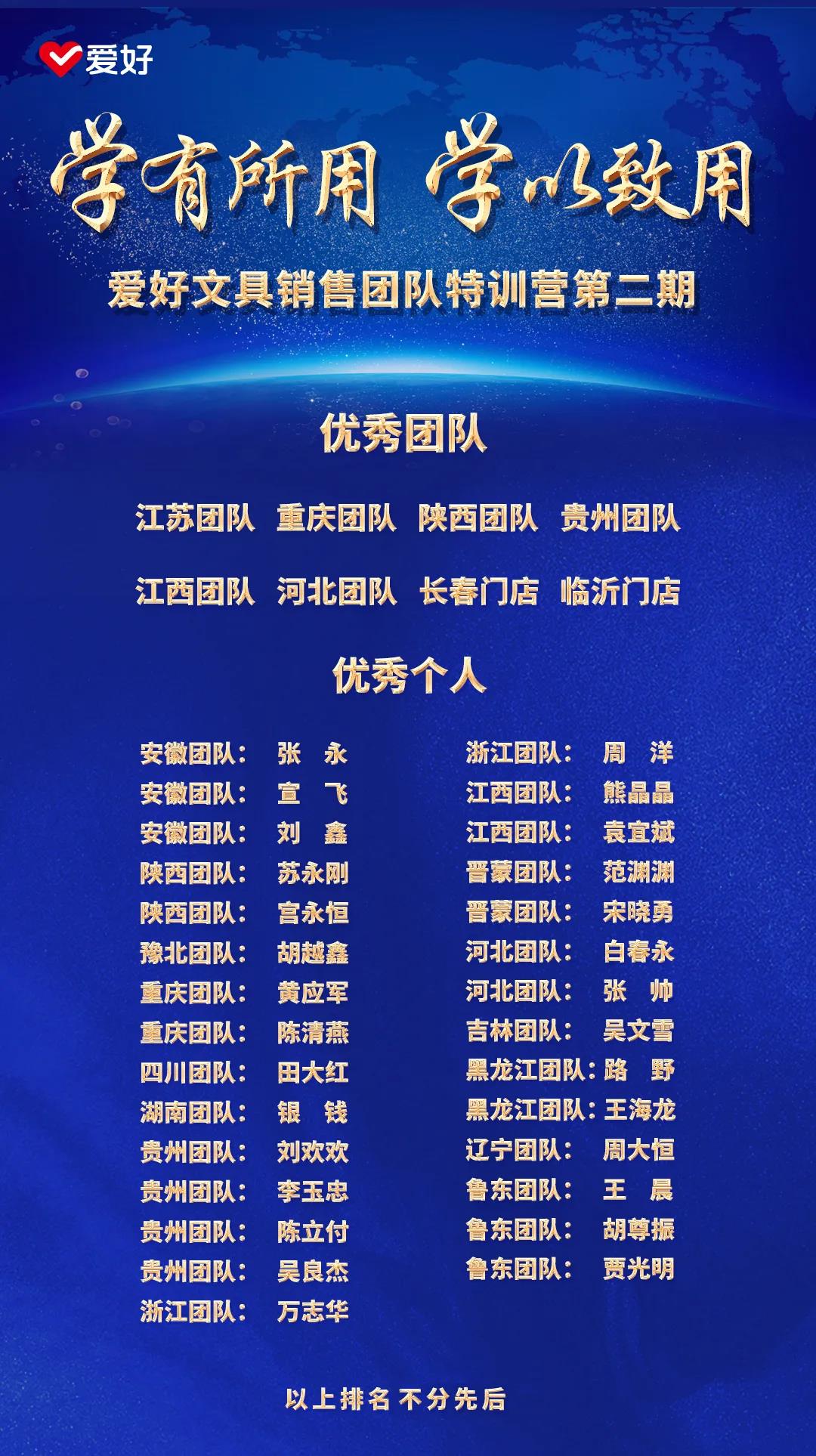 經(jīng)過激烈的比拼,愛好文具銷售團隊特訓(xùn)營第二期最終評選出8支優(yōu)秀團隊和29名優(yōu)秀個人。